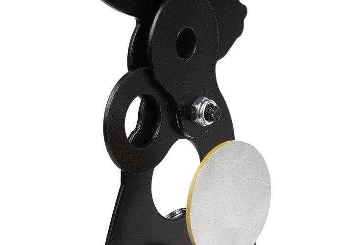 Most field targets have a string attached to the target to pull it back into position once the kill zone has been hit. But this shoot-to-reset target requires no string and resets when you shoot the reset plate that hangs down.