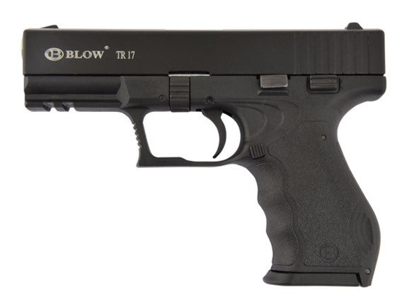 This Blow TR17 is 16 shot 9mmPAK semi auto pistol with metal upper and black barrel with a polymer lower